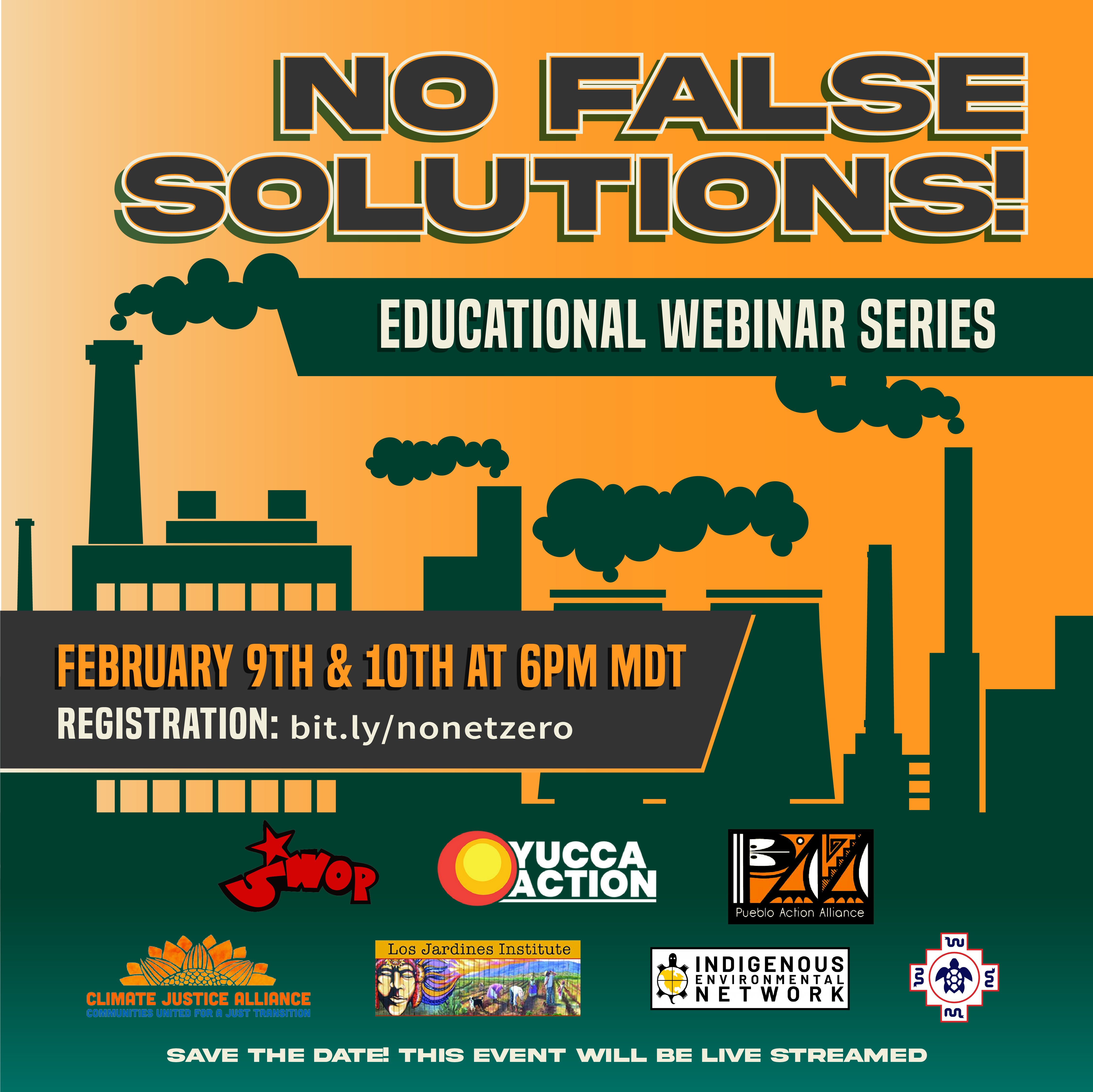 We are presenting a two-part series of online educational webinars that will help our community members build knowledge on the current climate of environmental justice in New Mexico, including highlighting no net zero and rejecting false solutions. We will be joined by guest speakers as well as communitty youth advocates to give you a better idea of legislative updates, key terms, historical context, and organizing action opportunities. We will also talk about why local organization groups, international allies and indigenous groups worldwide are against net zero.